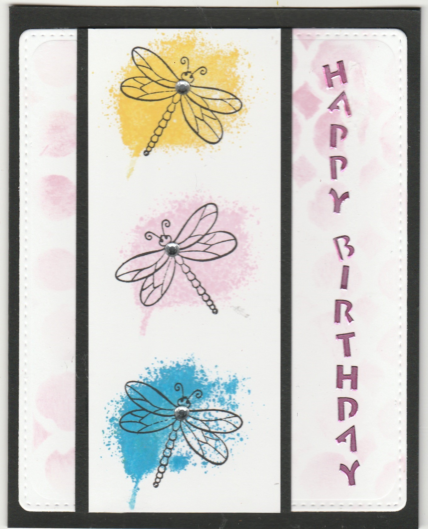 The background splotches are from a set by Paperbabe, the dragonflys are unnamed, and I also used a peeloff to finish off. The dragonfly panel was a scrap layered onto the piece cut from the end of the card base